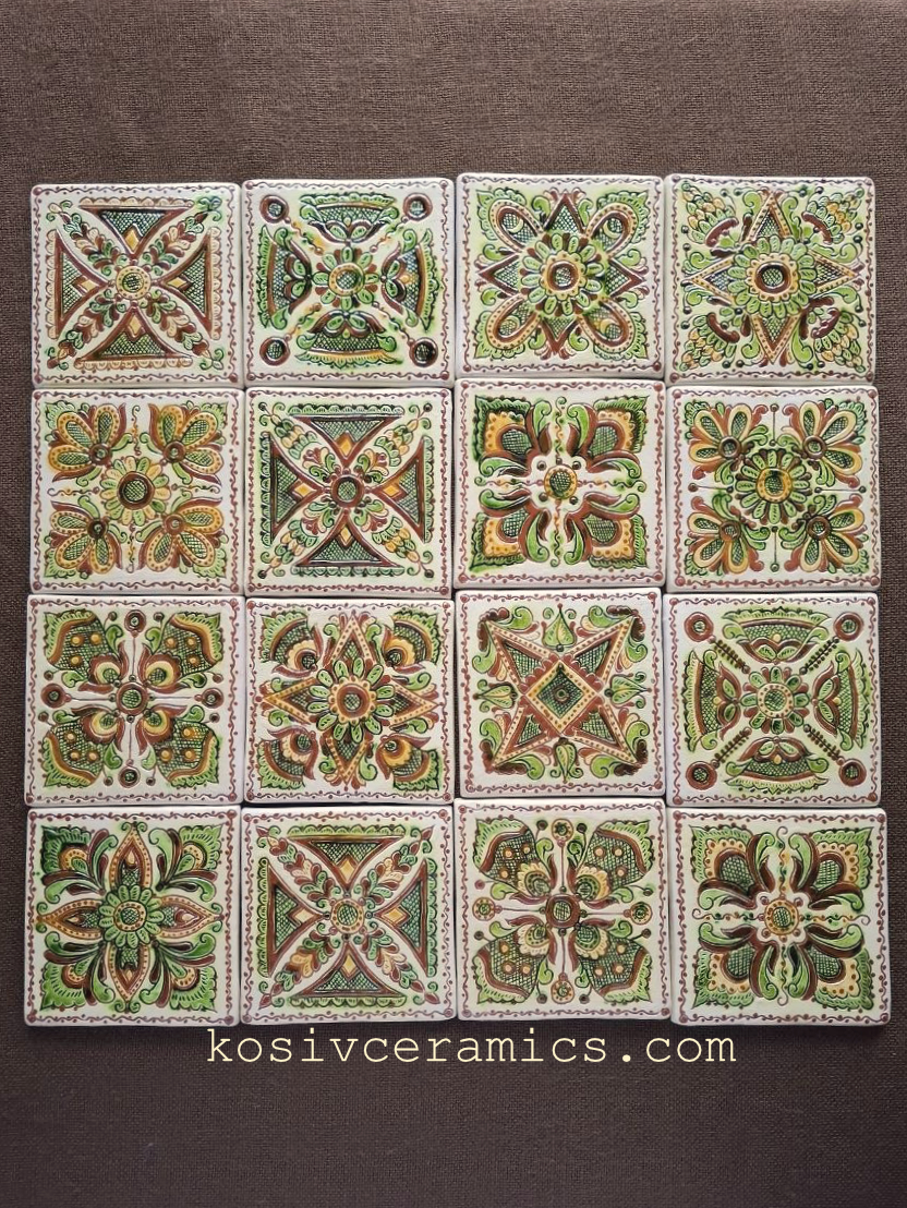 Набір із 16 керамічних плиток ручної роботи. Розмір кожної — 10×10 см. Підходять для декоративного використання в інтер’єрі або як функціональні вставки. Кожна плитка має індивідуальний орнамент, який не повторюється.