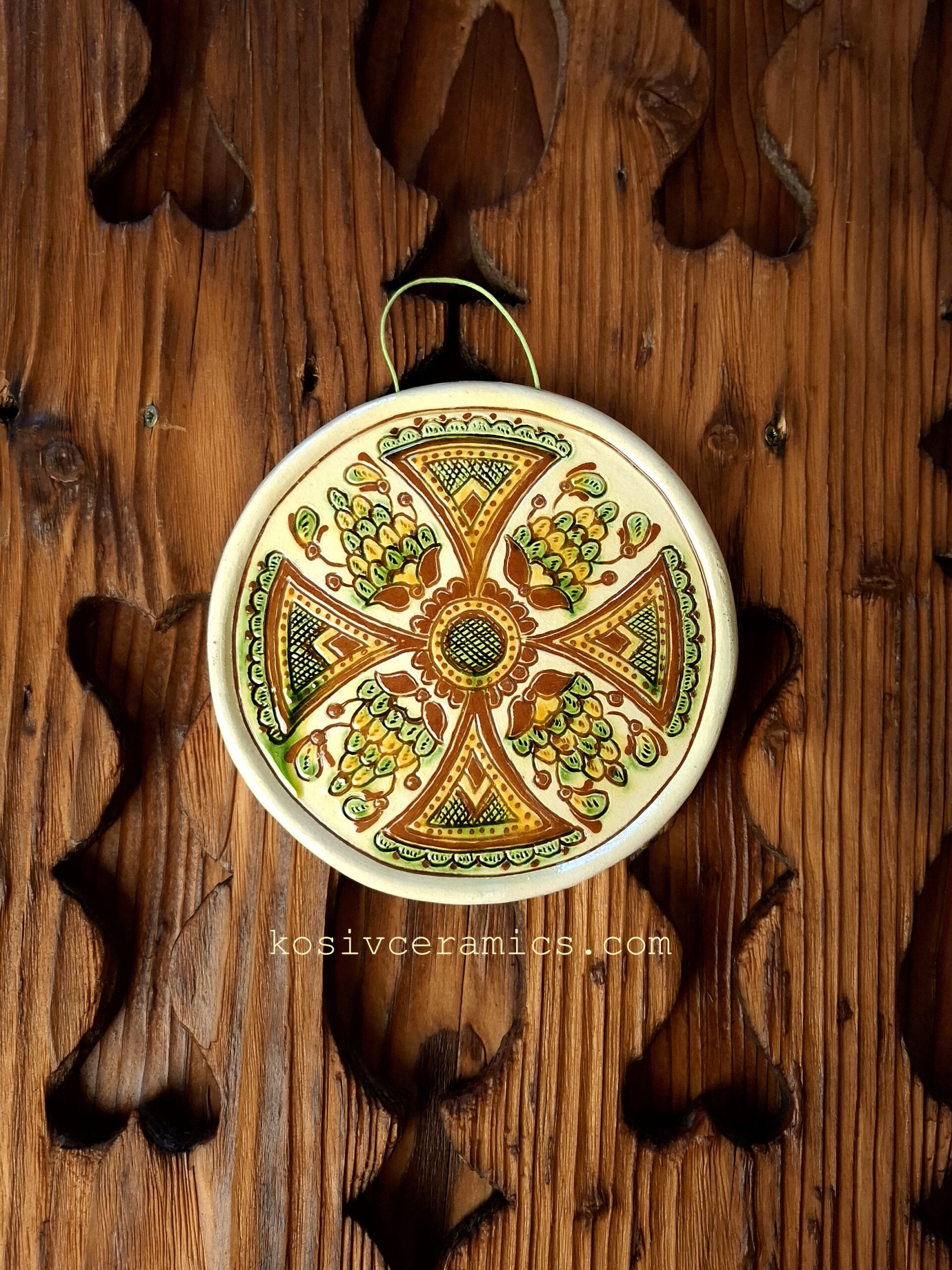 Керамічна кругла підвіска ручної роботи з малюнком хреста.