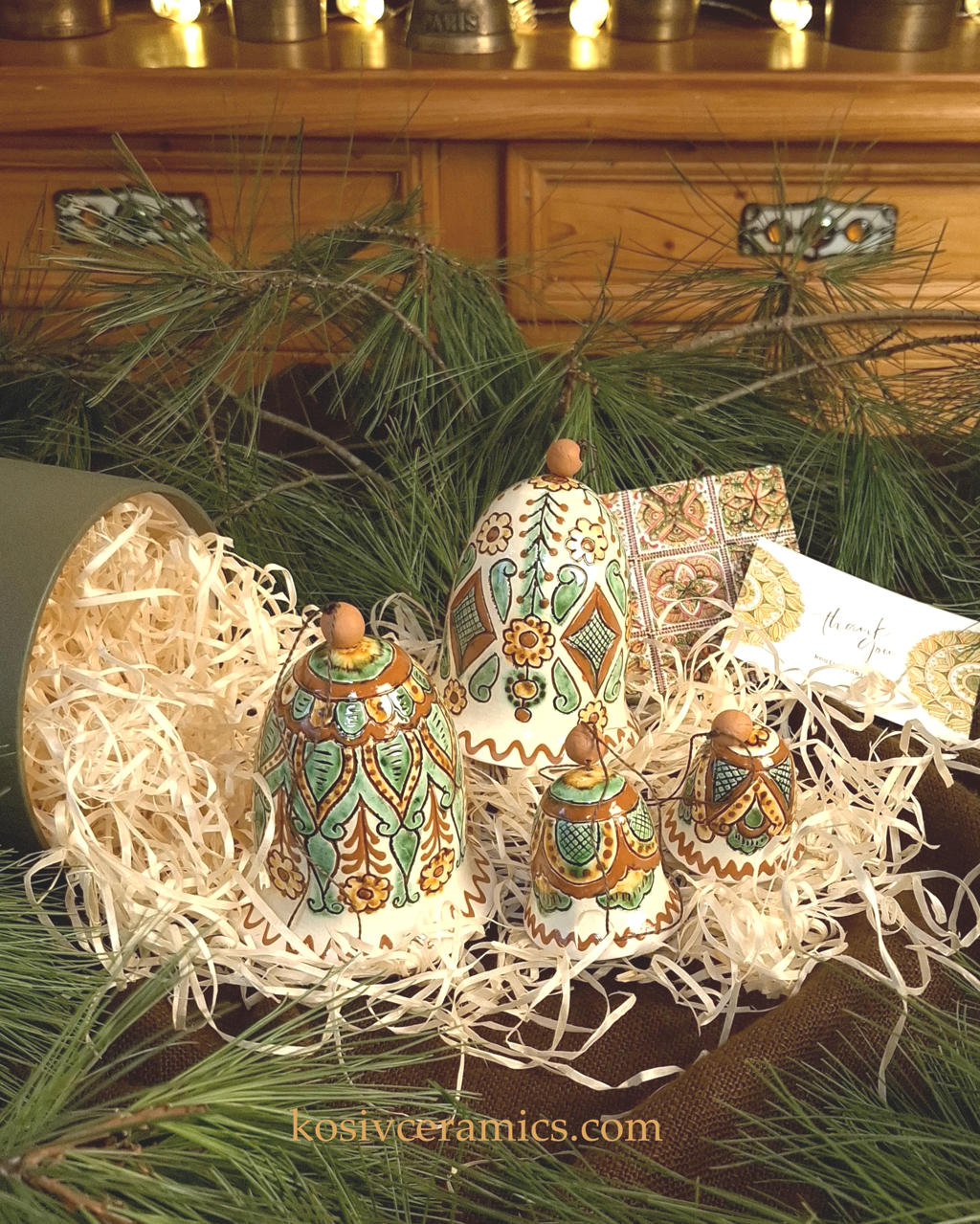 Цей набір — частинка традиції, яку можна тримати в руках. Великий дзвоник, як центр композиції, доповнюють менші, зі схожим орнаментом. Вони всі різні, але разом створюють гармонійну мелодію, яка звучить, мов ехо Карпат, тиха дзвінка мелодія тепла й затишку, що наповнює ваш дім.