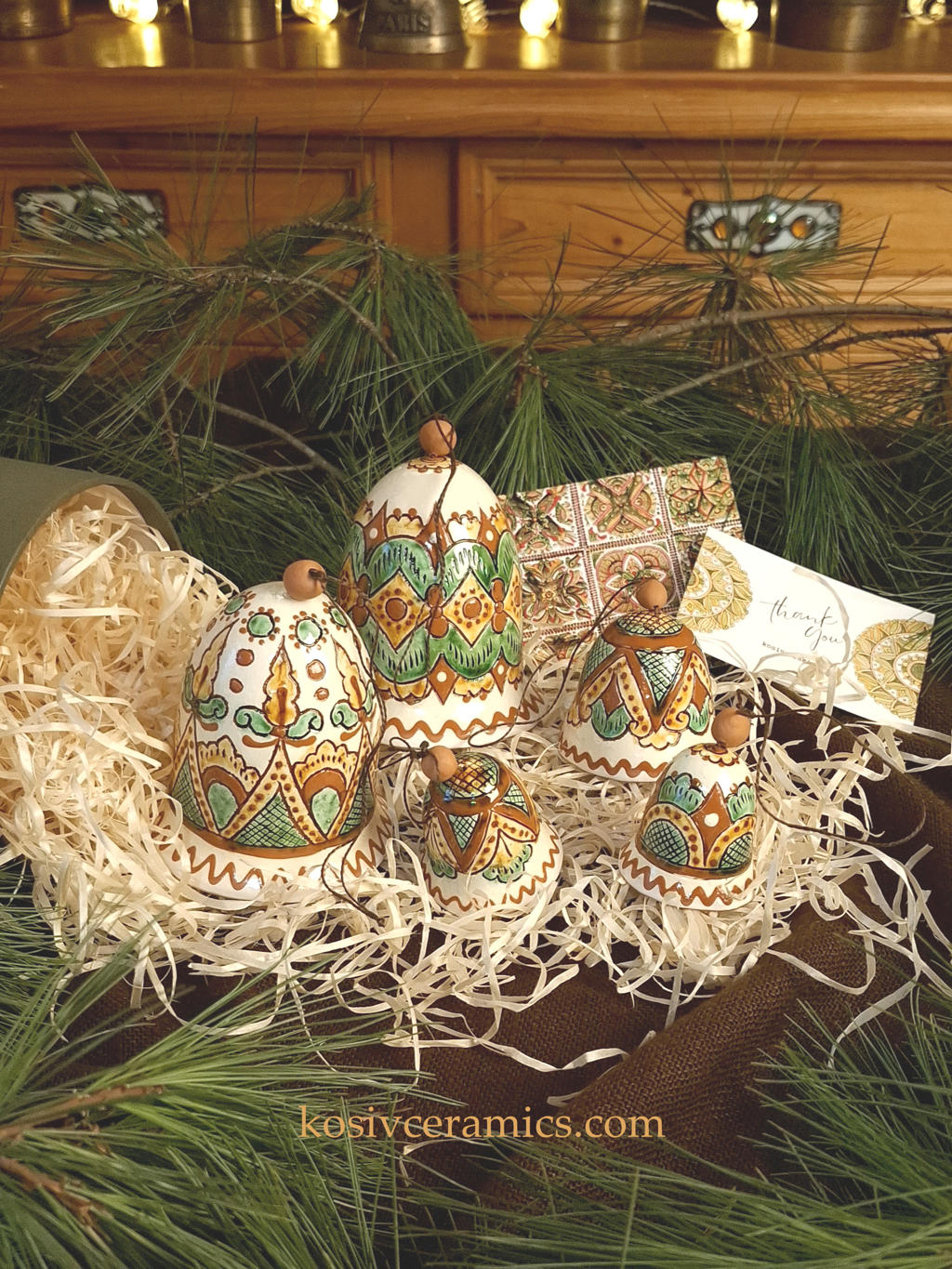 Цей набір — частинка традиції, яку можна тримати в руках. Великі дзвоники, як центр композиції, доповнюють три менші, кожен з іншим орнаментом. Вони всі різні, але разом створюють гармонійну мелодію, яка звучить, мов ехо Карпат, тиха  дзвінка мелодія тепла й затишку, що наповнює ваш дім.