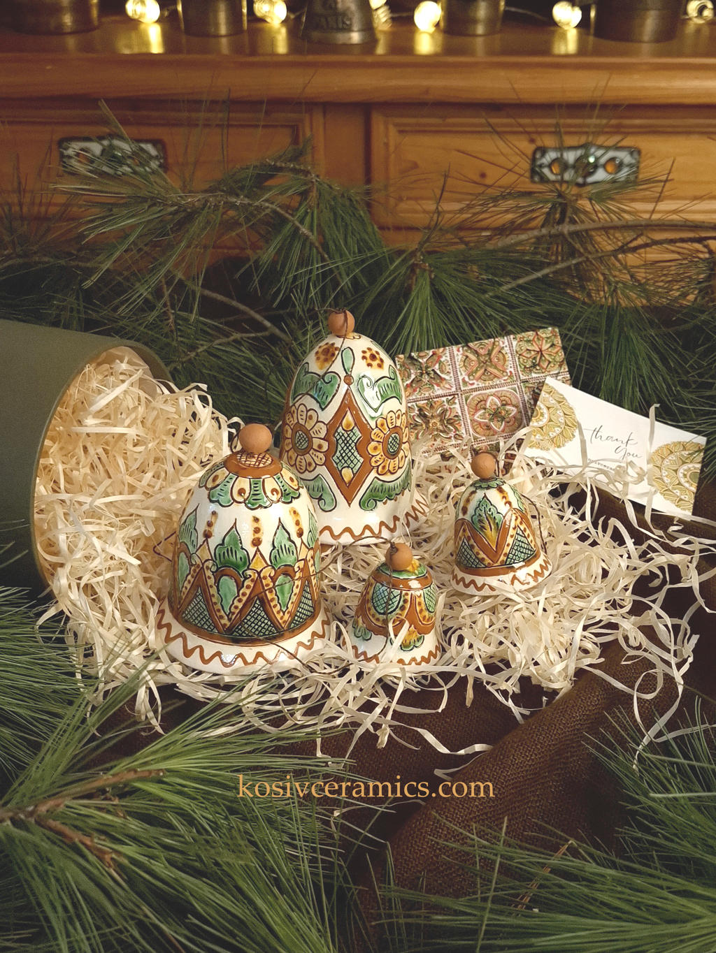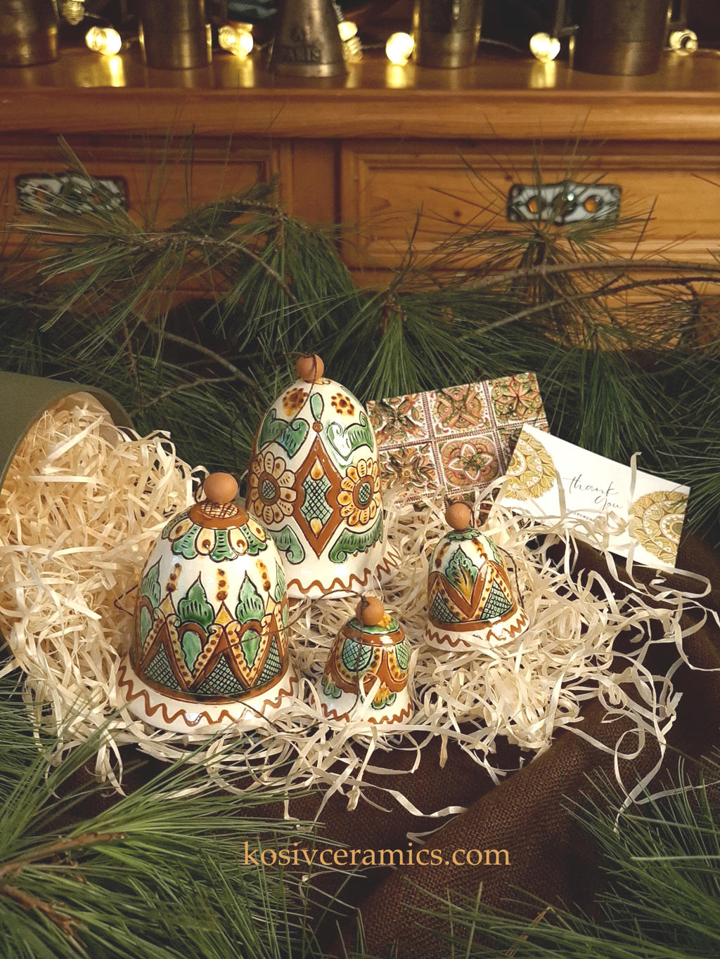 Цей набір — частинка традиції, яку можна тримати в руках. Великі дзвоники, як центр композиції, доповнюють три менші, кожен з іншим орнаментом. Вони всі різні, але разом створюють гармонійну мелодію, яка звучить, мов ехо Карпат, тиха  дзвінка мелодія тепла й затишку, що наповнює ваш дім.